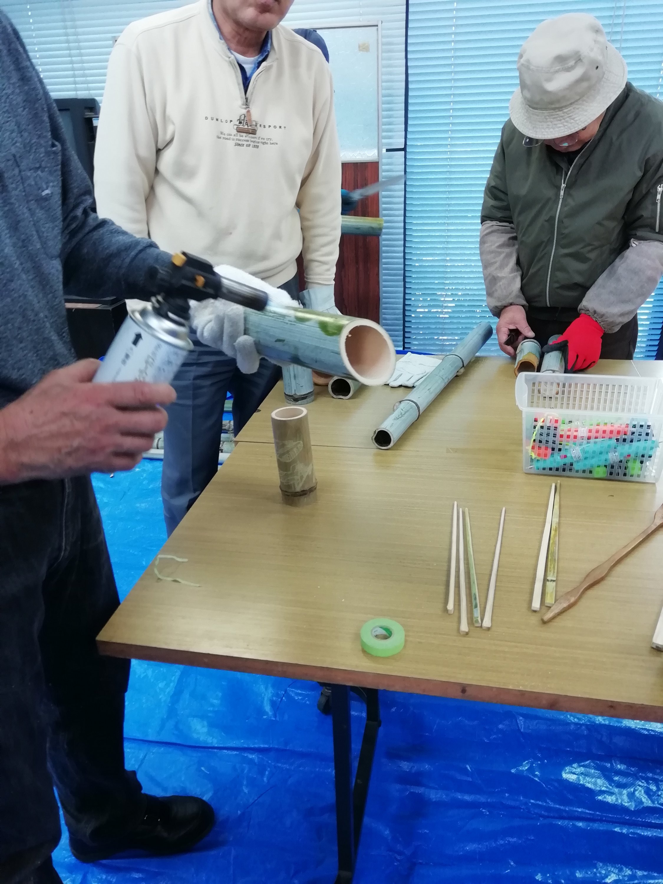 竹を切るときは、マスキングテープを巻いて、それを目印に切るとまっすぐきれいに切りやすい。バーナーであぶると、きれいな青い色が出る。などなど。写真一枚めから二枚め、竹の色が、白っぽいものから、きれいな青に変わったのがわかりますでしょうか。