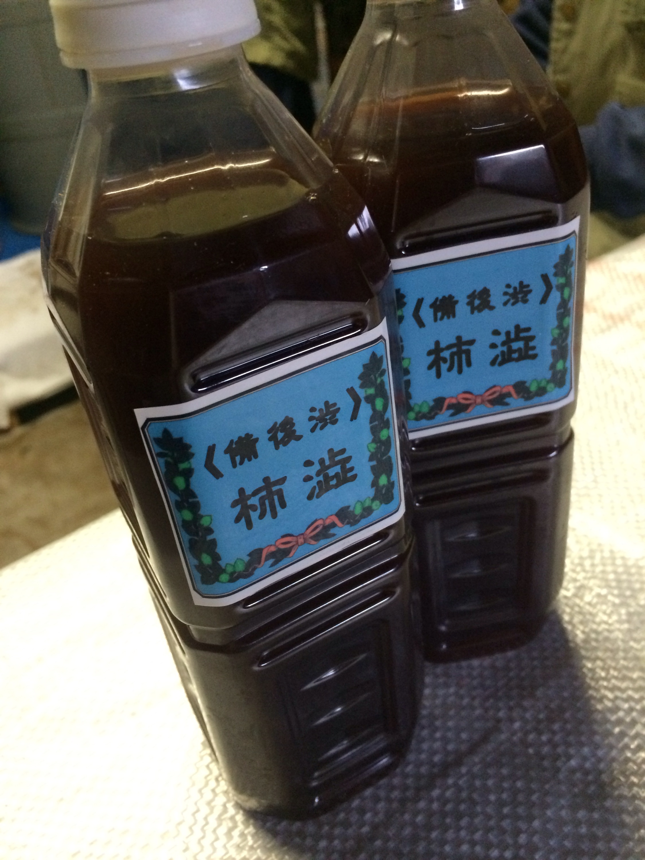 2014年製造の柿渋を出荷はじめました。移動して少し置いてから上澄みを詰めるようにして、澱が底にたまらないようになったかなあ。まだ色が少し若いかも? うすく見えることがあるかもしれませんが、濃度はいつもと同じ比重3.5あります。